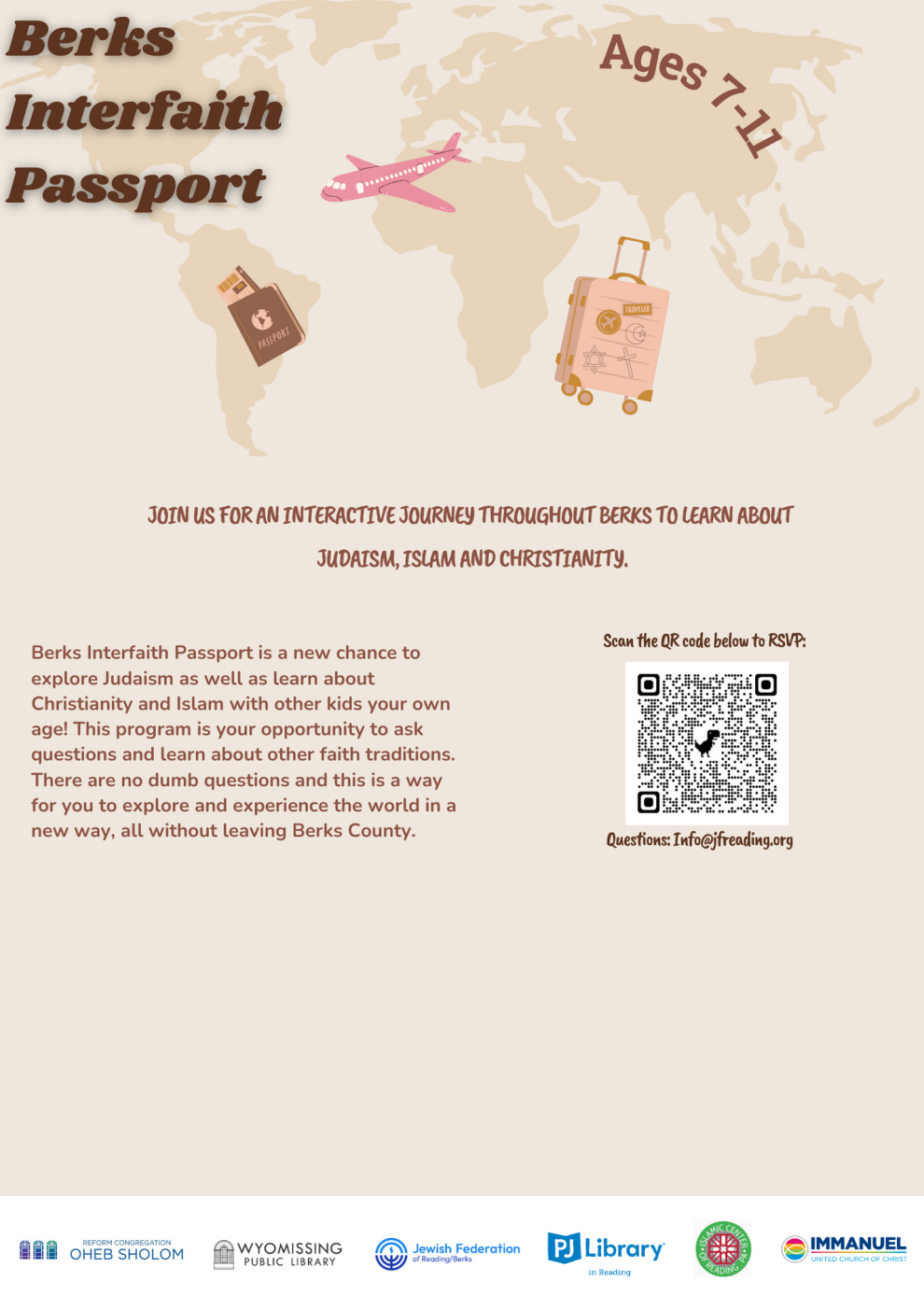 Berks Interfaith Passport is a new chance to explore Judaism as well as learn about Christianity and Islam with other kids your own age! This program is your opportunity to ask questions and learn about other faith traditions. There are no dumb questions and this is a way for you to explore and experience the world in a new way, all without leaving Berks County.