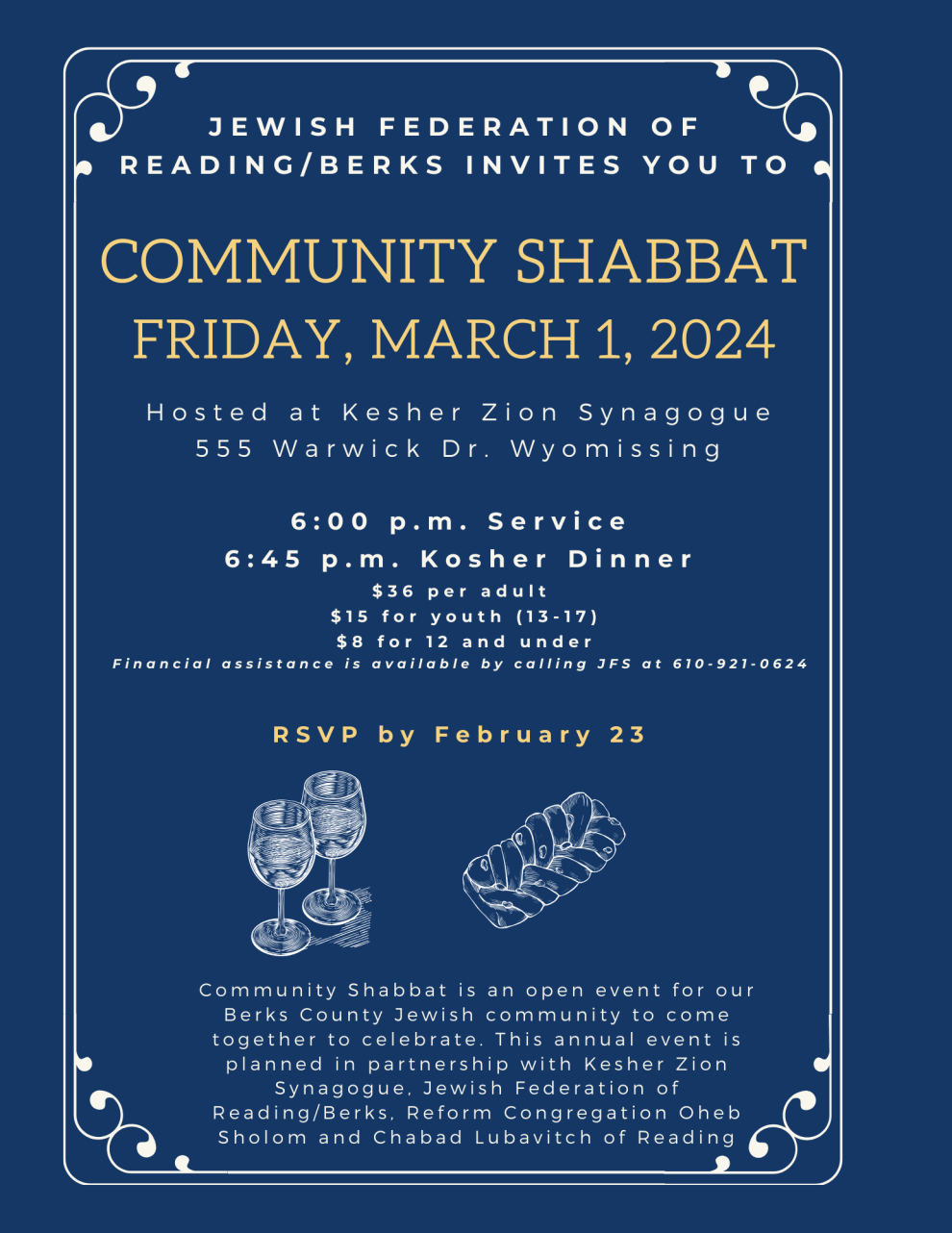 Community Shabbat is an open event for our Berks County Jewish Community to come together to celebrate. This annual event is planned in partnership with Kesher Zion Synagogue, Jewish Federation of Reading/Berks, Reform Congregation Oheb Sholom and Chabad Lubavitch of Reading.