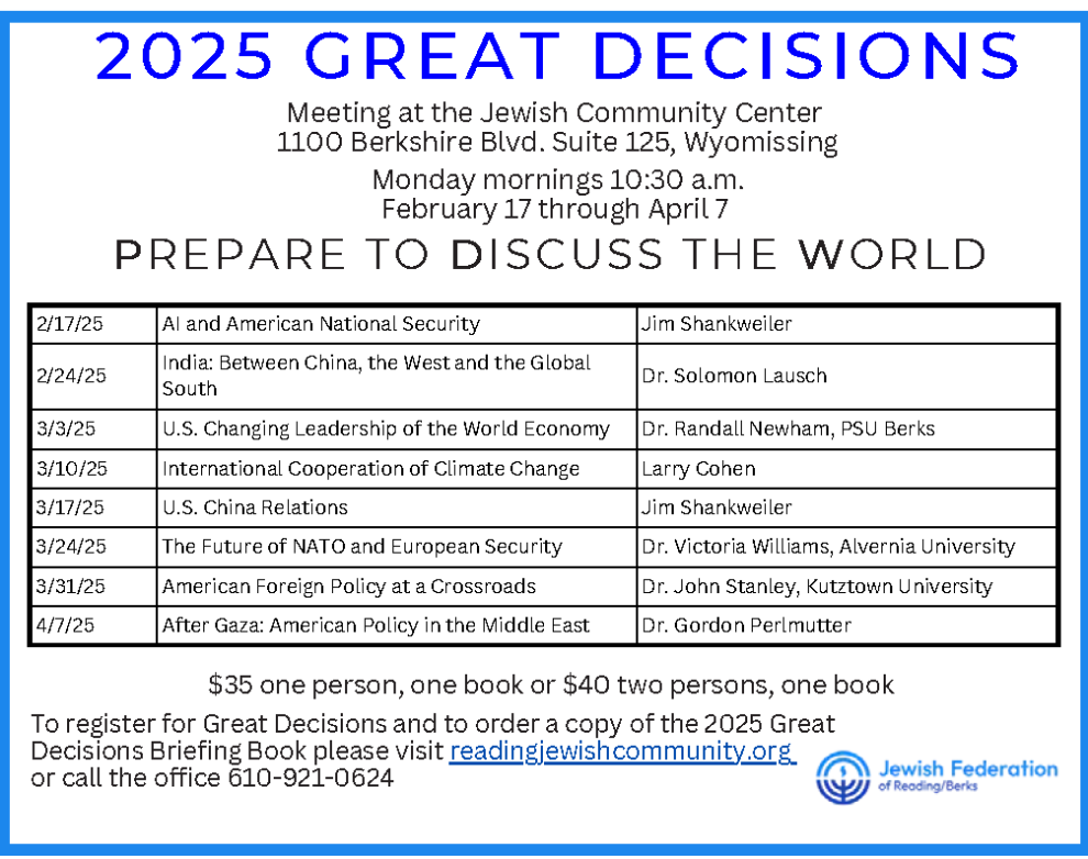For more info or to RSVP please click here Jewish Federation of Reading/Berks or call 610-921-0624