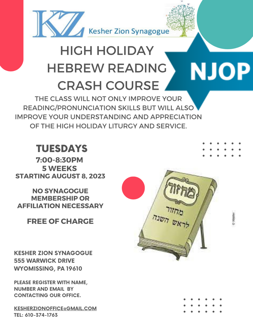 The Class will not only improve your reading/pronunciation skills but will also improve your understanding and appreciation of the high holiday liturgy and service.