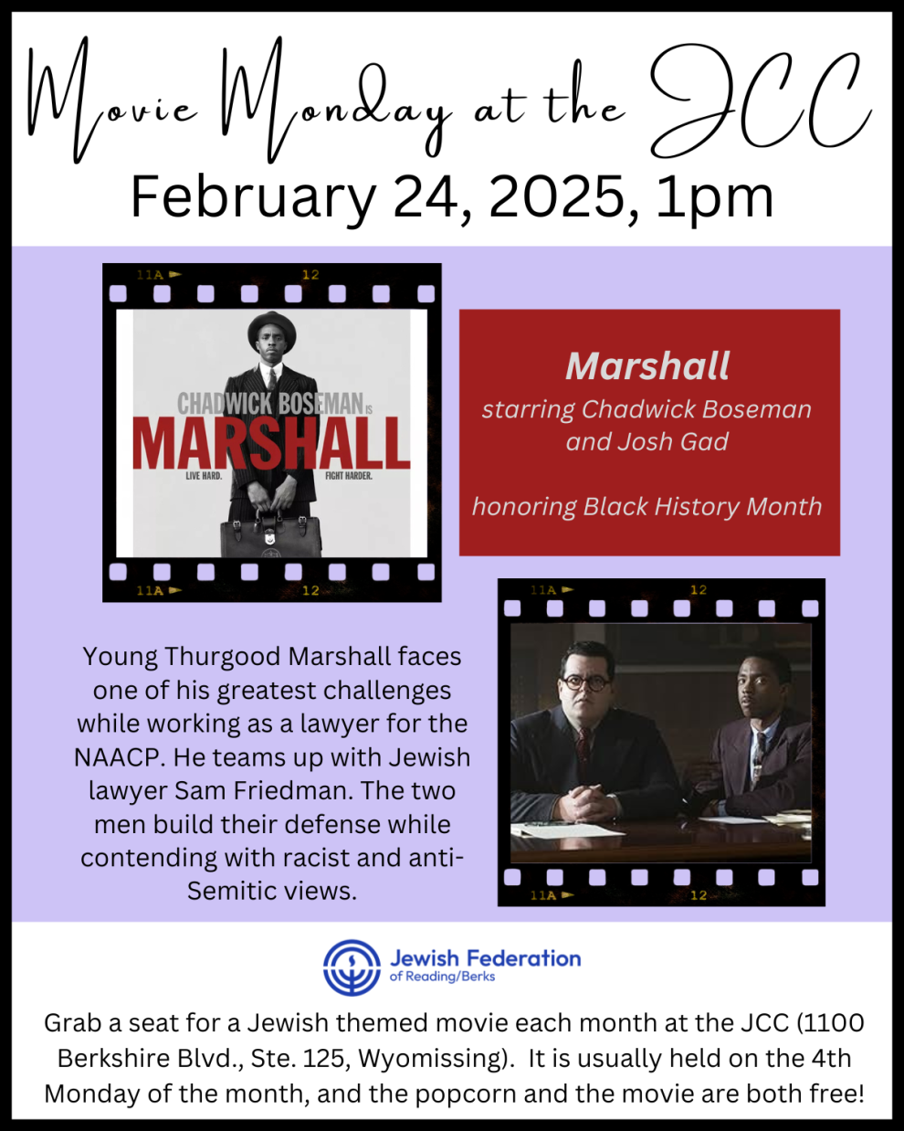 Grab a seat for a Jewish themed movie each month at the JCC. It is usually held on the 4th Monday of the month, the popcorn and movie are both free!