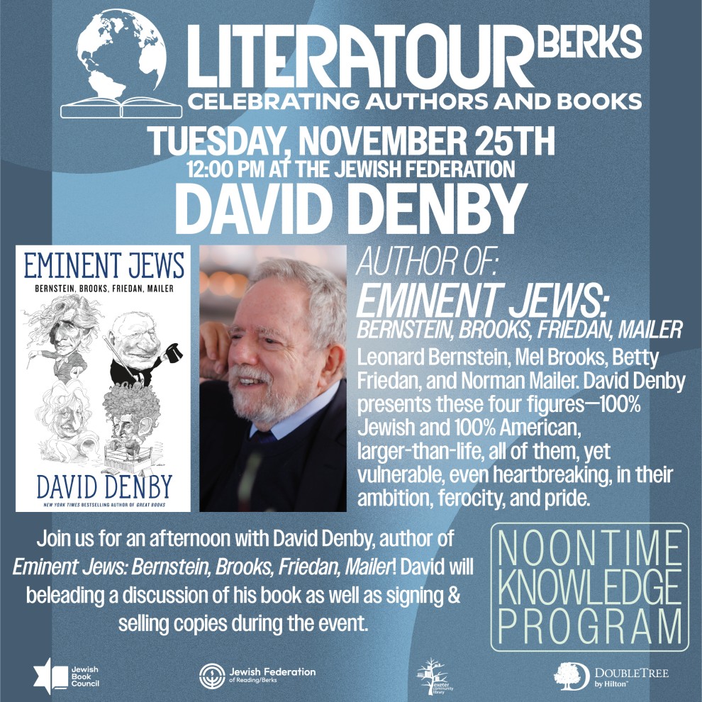 We welcome Literatour Berks author David Denby, who will speak about his book Eminent Jews: Bernstein, Brooks, Friedan, and Mailer.
