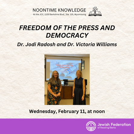Noontime Knowledge is a free program, held twice monthly, provided by the Jewish Federation of Reading/Berks to educate our community on a variety of topics.