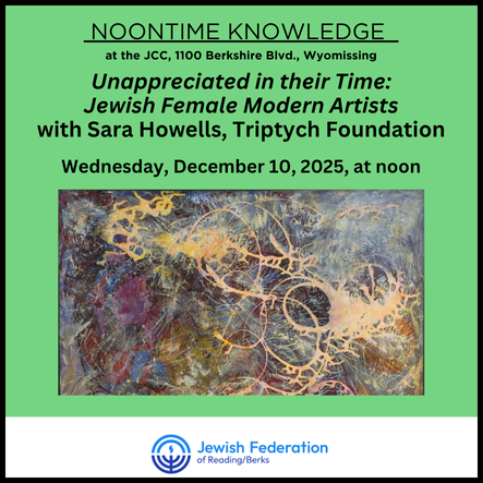 Join us at the JCC on Wednesday, December 10, at noon, for Sara Howell’s lecture, “Unappreciated in their Time: Jewish Female Modern Artists.”