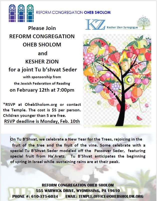 Please join Reform Congregation Oheb Sholom and Kesher Zion for a joint Tu B'Shvat Seder with sponsorship from Jewish Federation of Reading on February 12th at 7:00pm.