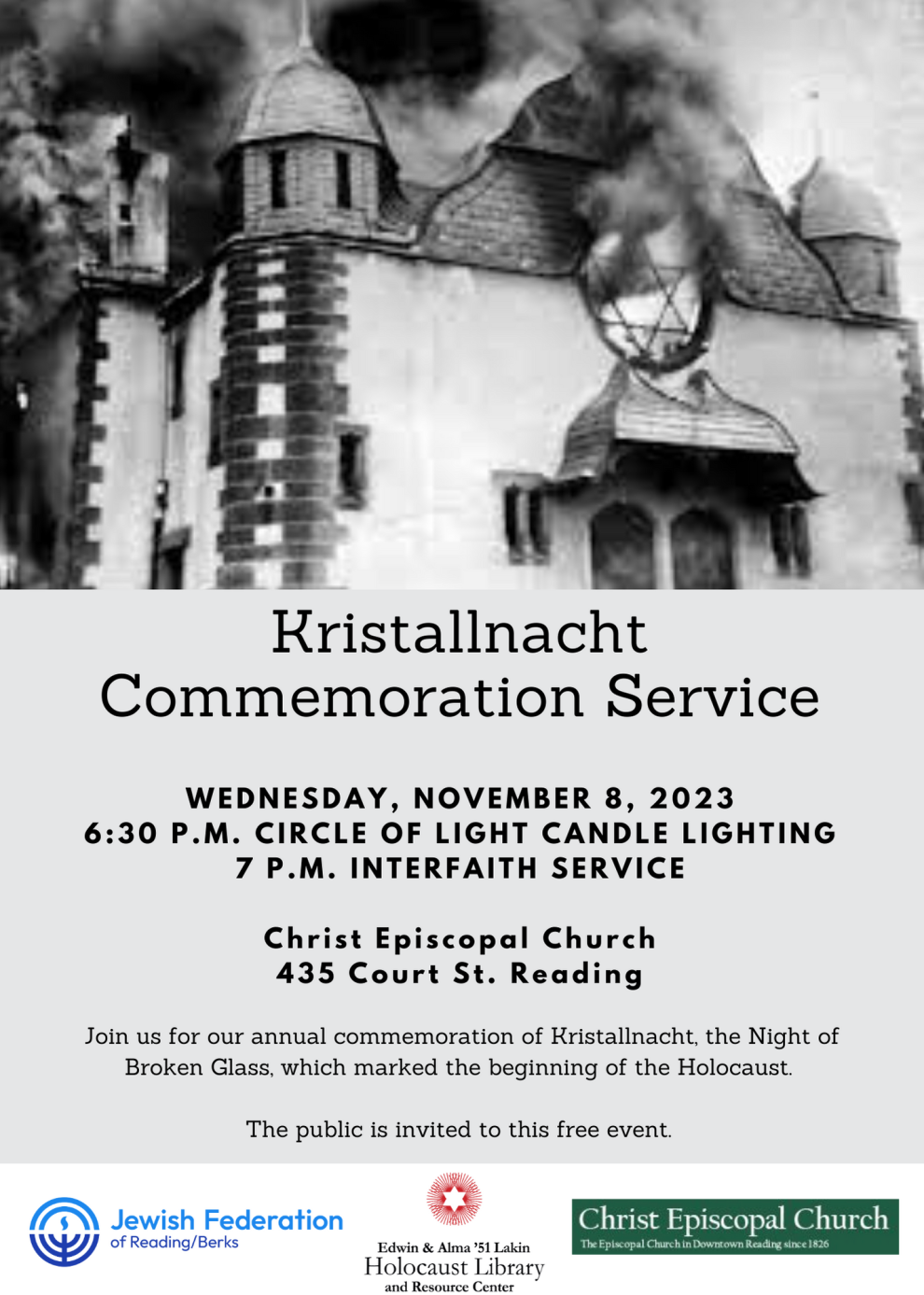 The public is invited to this free event for our annual commemoration of Kristallnacht, the Night of Broken Glass, which marked the beginning of the Holocaust.