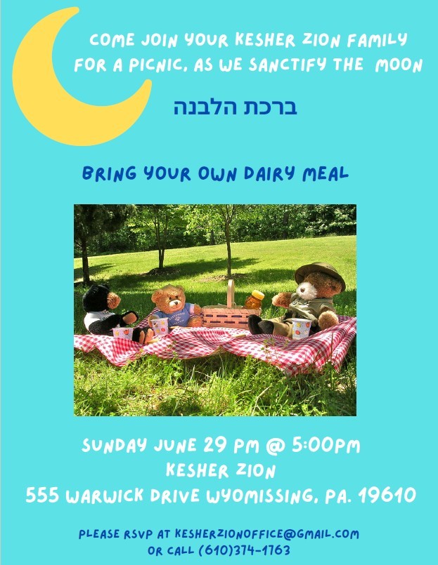 Come join your keshion zion family for a picnic (bring your own dairy meal) as we sanctify the moon.