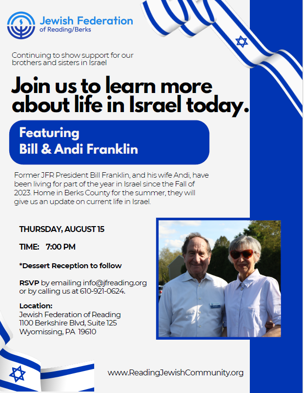 Continuing our support for our brothers and sisters in Israel join us to learn about life in Israel today with former president Bill Franklin and his wife Andi.