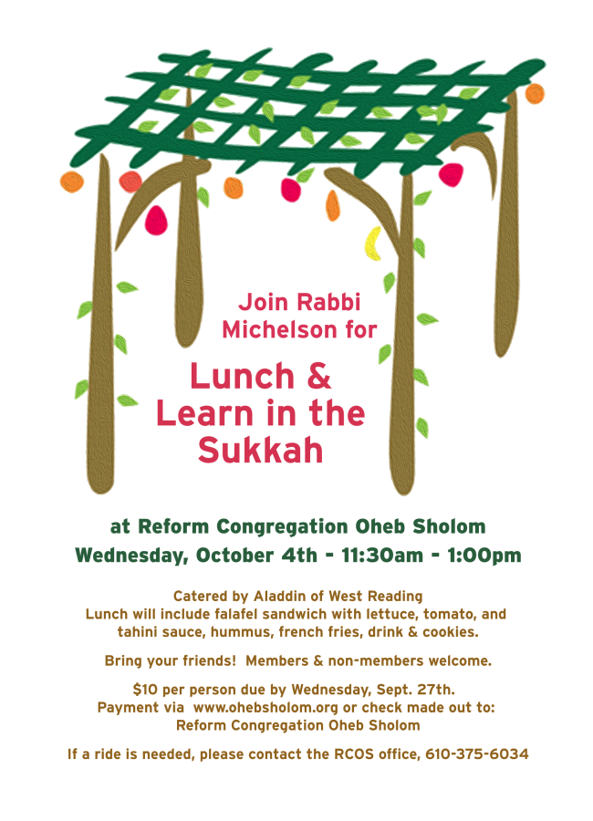 Bring your friends and join Rabbi Michelson for a Lunch & Learn in the Sukkah! Members & Non-members welcome. $10 per person due by Wednesday September 27th.