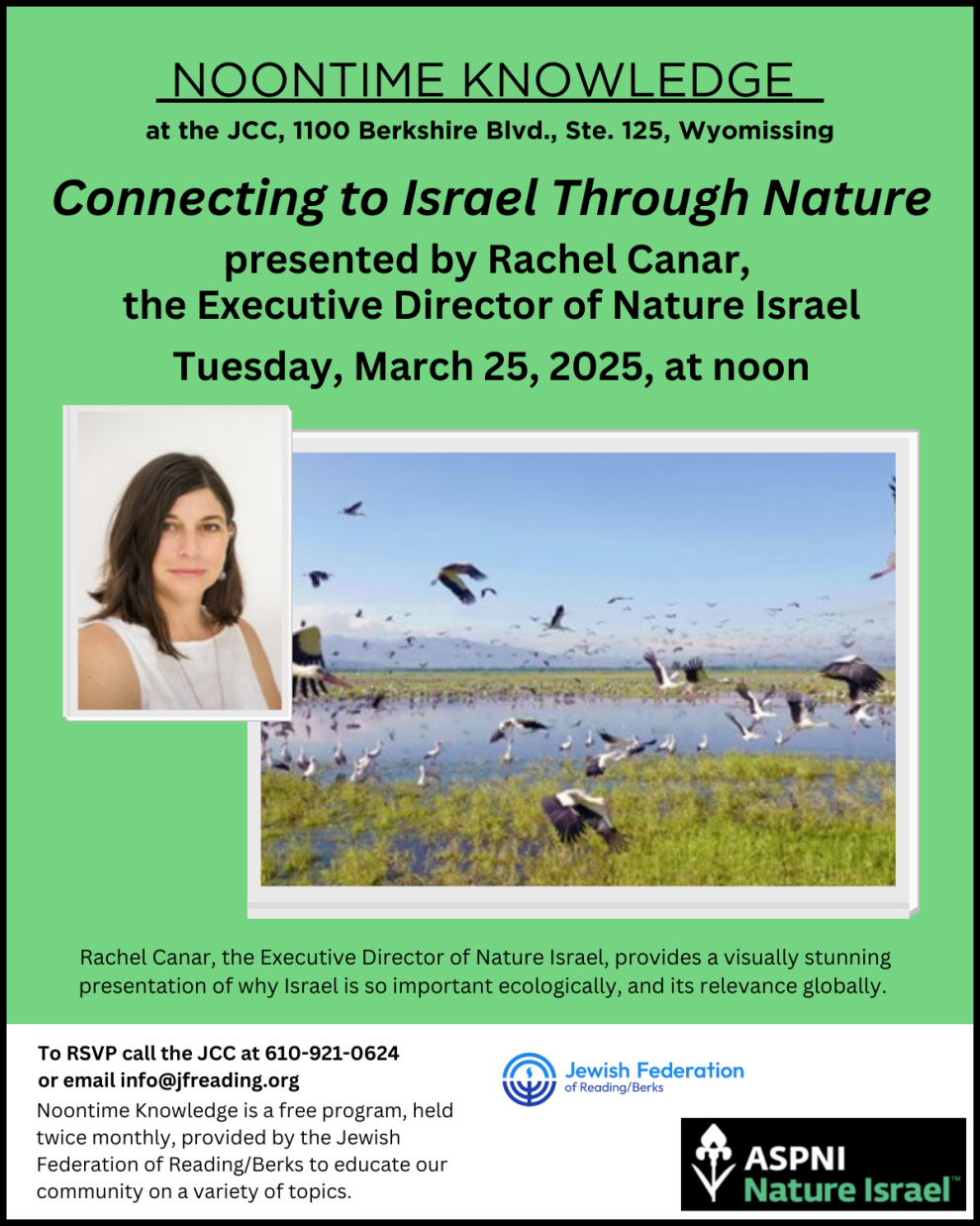 Connecting to Israel Through Nature presented by Rachel Canar, the executive director of Nature Israel.
