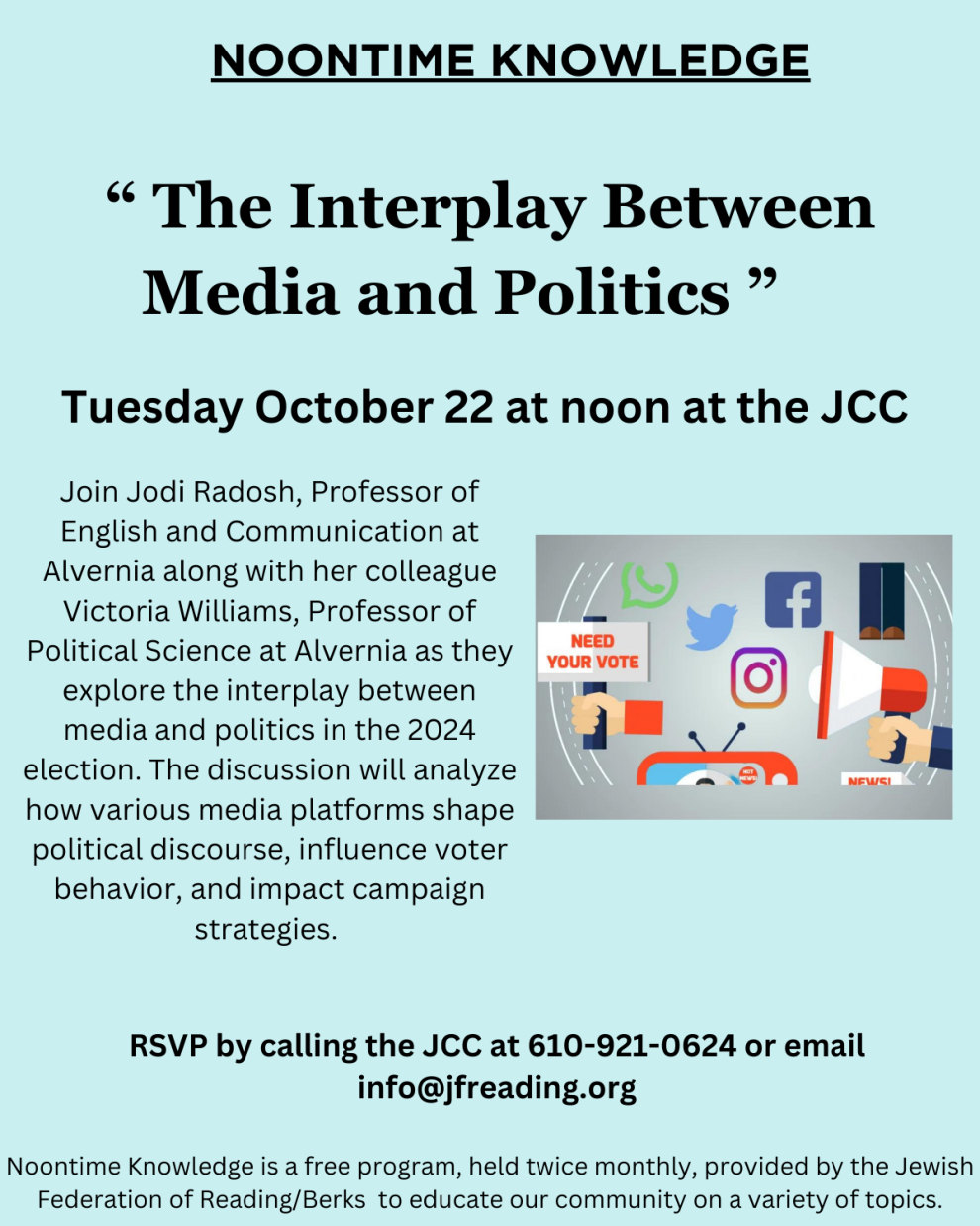 Join Jodi Radosh, Professor of English and Communication at Alvernia along with her colleague Victoria Williams, Professor of Political Science at Alvernia as they explore the interplay between media and politics in the 2024 election. The discussion will analyze how various media platforms shape political discourse, influence voter behavior, and impact campaign strategies.