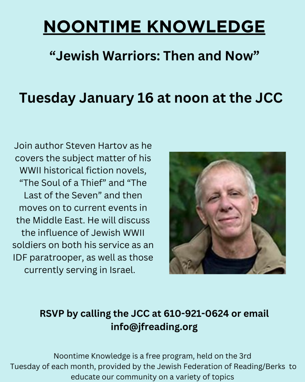 Join author Steven Hartov, as he covers the subject matter of his WWII historical fiction novels, " The Soul of a Thief" and " The Last of the Seven" and then moves on to current events in the Middle East. He will discuss the influence of Jewish WWII soldiers on both his service as an IDF paratrooper, as well as those currently serving in Israel.