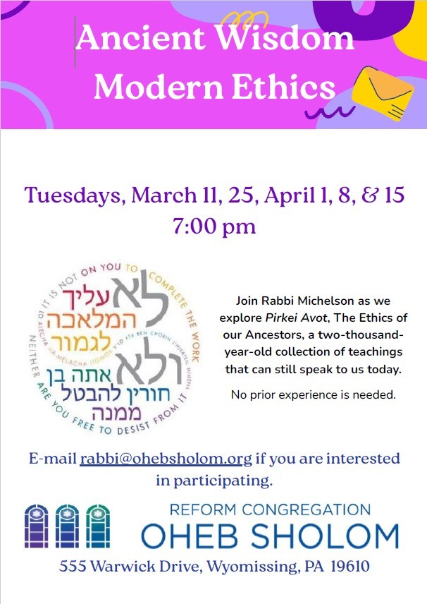 Join Rabbi Michelson as we explore Pirkei Avot, The Ethics of our Ancestors, a two-thousand-year-old collection of teachings that can still speak to us today.