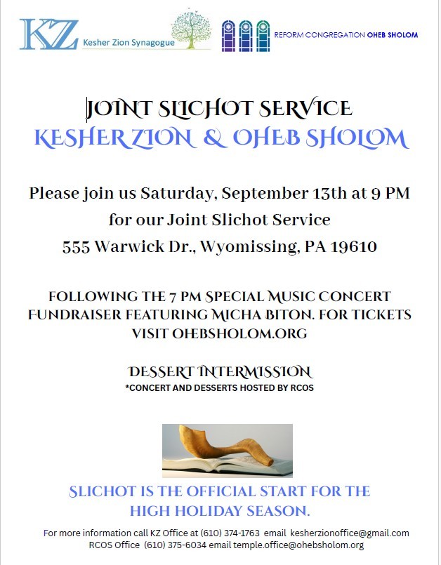 Please join KZ and RCOS for their joint Slichot Service 555 Warwick Dr Wyomissing PA 19610 at 9pm