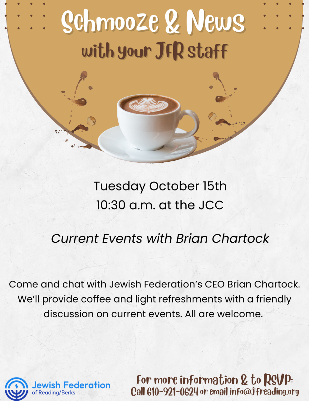 Come and chat with Jewish Federations CEO Brian Chartock. We'll provide coffee and light refreshments with a friendly discussion on currents events. All are welcome.