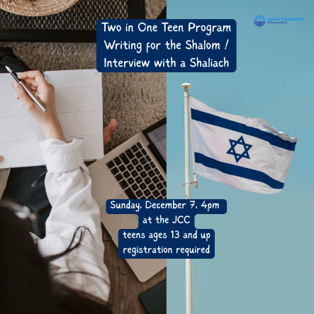 First, teens are invited to write articles for the Shalom, this Jewish newspaper. Our community benefits from hearing from a multitude of voices, especially those from the next generation. And teens need an outlet to share their thoughts and experiences (plus build their resumes and extra-curricular experiences). Any interested teens are invited to come learn about what it takes to write for the Shalom directly from Mark Nemirow, the editor. They will be able to ask their questions and get valuable information like expectations and deadlines!
