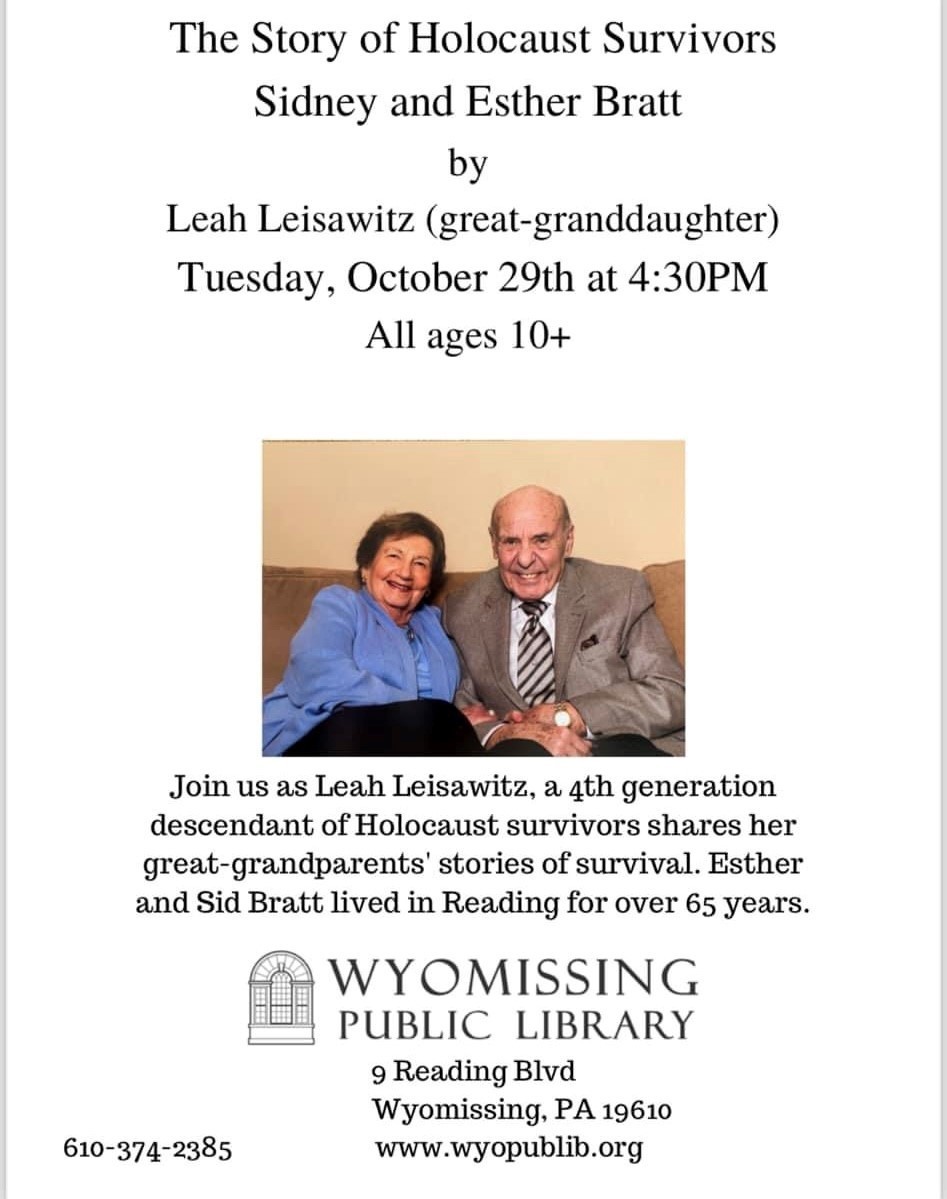 Join Leah Leisawitz, a 4th generation descendant of Holocaust survivors as she shares her great-grandparents' stories or survival. Leah wants to bring Holocaust awareness to help ensure that history does not repeat itself as part of her Bat Mitzvah project.