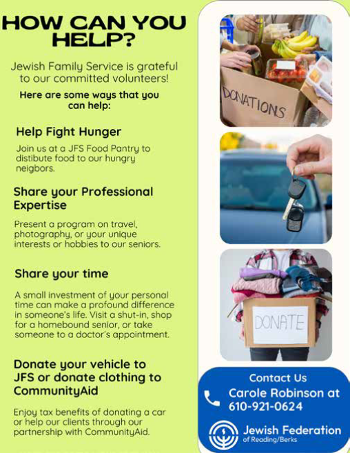 Jewish Family Service is grateful to committed volunteers who participate in programs that greatly benefit members of the community. We welcome inquiries from prospective volunteers who are able to share their time to help others. Here are some programs that volunteers are needed for.